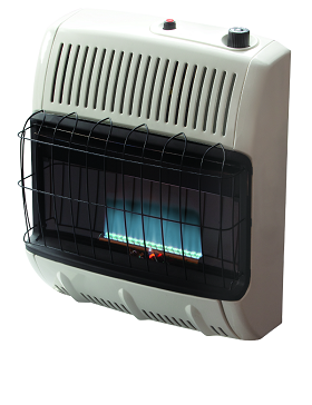 This heater is a propane fired, vent free, blue flame heater that produces 30,000 BTU's of efficient and comfortable heat. This safe, clean-burning heater has a five setting heat control, low oxygen shut off sensor and burns 99.9% efficient. This unit is easily installed as a wall mount unit or as a free standing unit with the included feet kit.