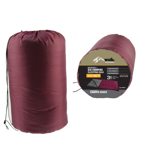 Good down to 40 degrees. This sleeping bag is filled with 3 lbs of hollow polyester fiber. Maroon. Comes with stuff sack with color bottom label.