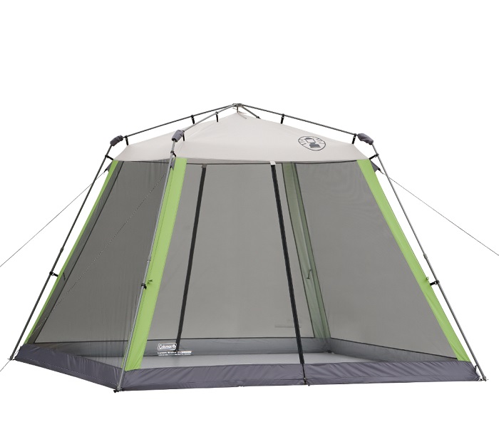 Find protection from the sun, wind and bugs under a Coleman® 10 ft. x 10 ft. (3 m x 3 m) Instant Screened Canopy at your next picnic, BBQ or campout. There's no assembly required. Just snap the pre-attached poles into place and have it up in a minute or less. Once it’s up, the canopy's UVGuard™ Protection blocks some of the sun's most harmful rays. Two large T-doors make for easy entry in the front and back. The doors are versatile too, with loops to keep doors open and zippers to keep them shut. When the fun is done, the compact frame design folds down in a minute or less and fits into an easy-pull wheeled carry bag that fits inside most cars.