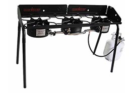 The Camp Chef Explorer 3X features three 30,000 BTU burners for maximum cooking versatility. A huge cooking surface will allow you to cook for large groups with ease. With the Explorer 3X you can grill, griddle, boil, or fry. Great for Dutch oven cooking as well. Drum style burner housing and three-sided wind screen protect flame from wind. Rugged construction is durable and built to last and removable legs make storage and portability easier. Great for use cooking any meal at camp, home, and the cabin. Plenty of cooking area for a Professional Barbecue Box and a Professional Griddle.
