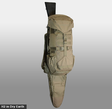 The H2 Gunrunner is a minimalist, lightweight rifle pack that's designed for hands-free hunting and quick access to your rifle. It gives you just the right amount of stowage for personal gear for a day's outing. The top compartment is a good size for range finders, calls, etc., and the main compartment is sized for a day's worth of food and clothing. It is hydration compatible (hydration sold separately). The pack has crossed vertical and horizontal compression straps, which are useful to grapple things to the pack, and a stowable waist belt for stabilizing the load when you're moving fast. 1400 cu.in.