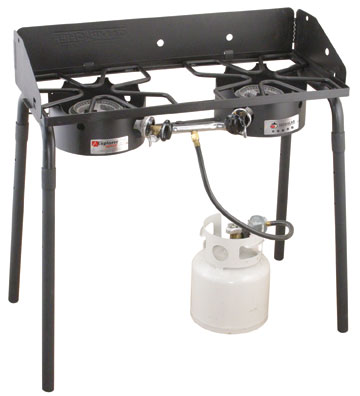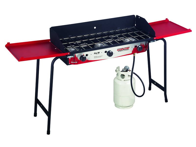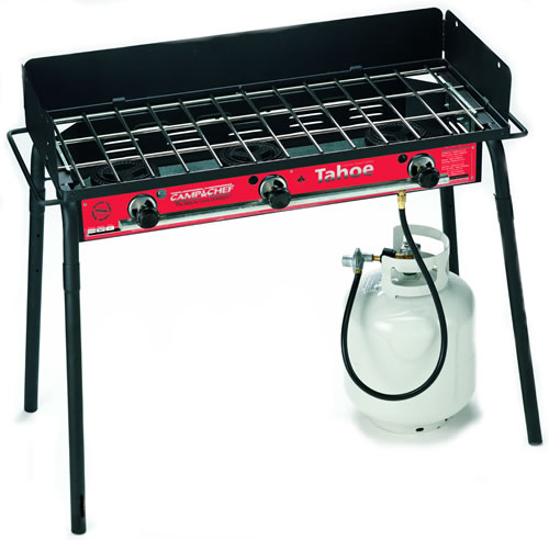 The Camp Chef Explorer 3X features three 30,000 BTU burners for maximum cooking versatility. A huge cooking surface will allow you to cook for large groups with ease. With the Explorer 3X you can grill, griddle, boil, or fry. Great for Dutch oven cooking as well. Drum style burner housing and three-sided wind screen protect flame from wind. Rugged construction is durable and built to last and removable legs make storage and portability easier. Great for use cooking any meal at camp, home, and the cabin. Plenty of cooking area for a Professional Barbecue Box and a Professional Griddle.