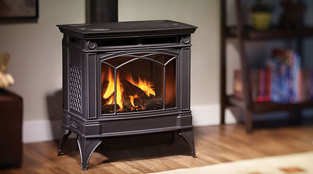 Compact Elegance. Even your smaller living areas can be transformed with the timeless beauty of durable cast iron Small Hampton Gas Stove. The 18,000 BTU of high efficiency heat can be turned down a full 50% so that you can enjoy the beautiful glow without all the heat.