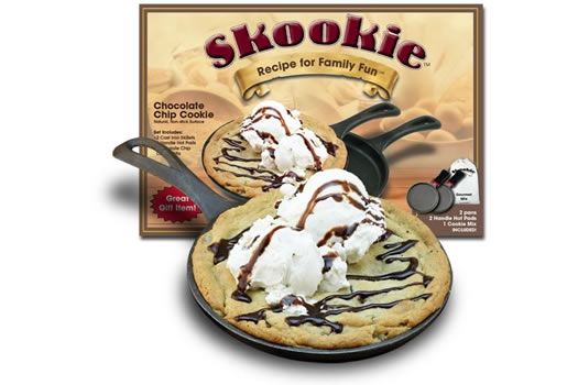 Each Box comes with two skillets, two grip-handle hot pads and a package of cookie mix.
