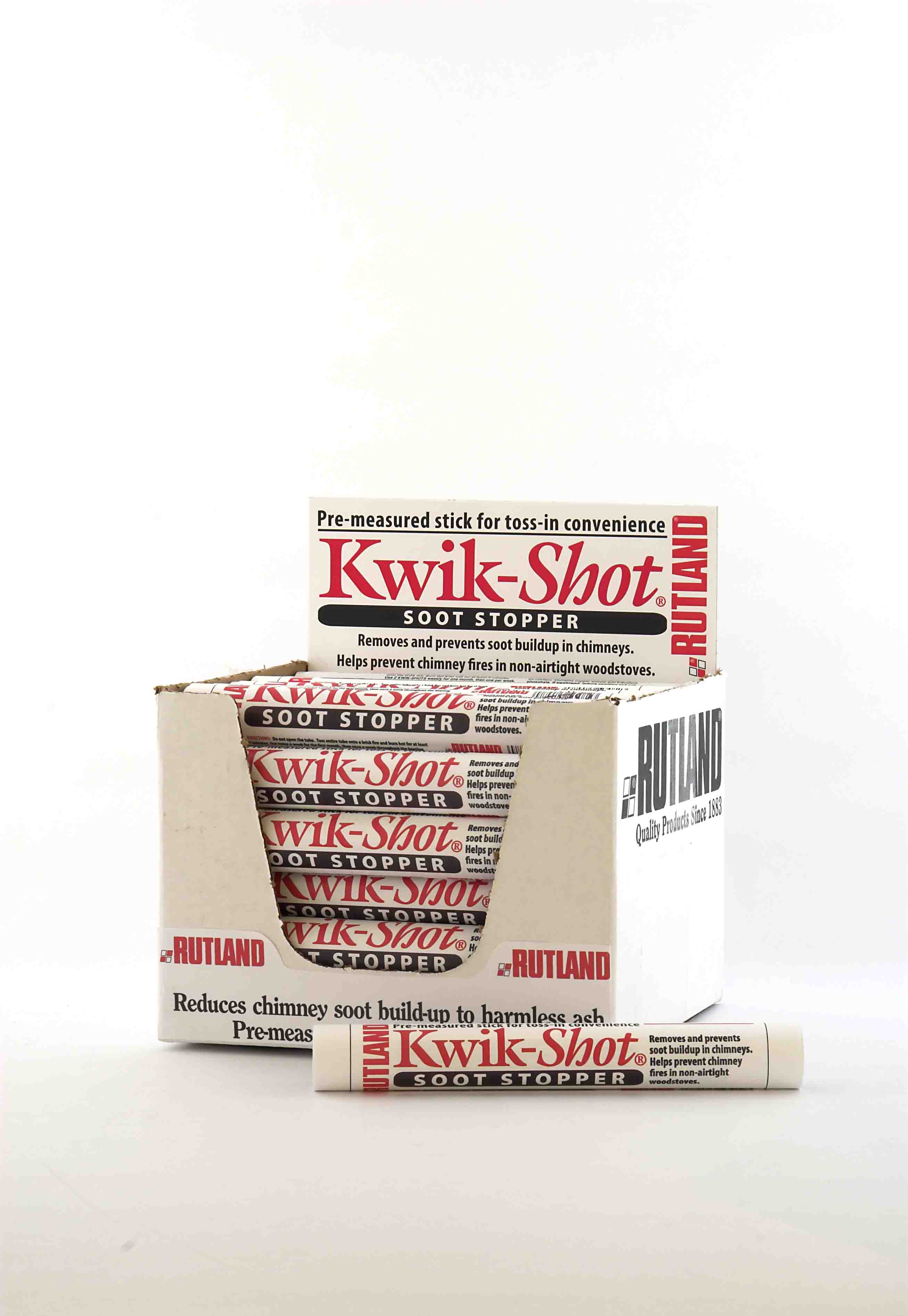 An easy-to-use toss-in stick that controls soot build-up in free-burning fireplaces, non-airtight stoves and oil-fired furnaces and boilers. Simply toss a Kwik-Shot Soot Stopper stick onto your fire, no measuring or mess. Makes colorful flames too!