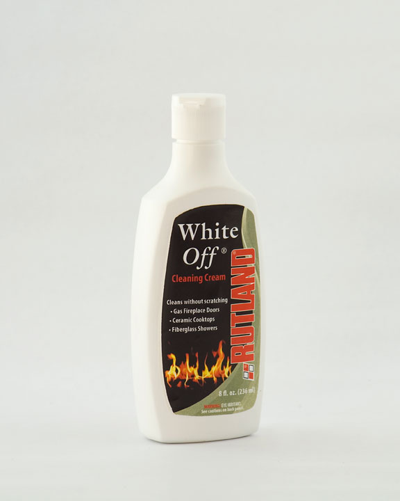 Non-abrasive White Off glass cleaning cream is specially formulated to remove white residue caused by gas log fires on glass fireplace doors. It cleans without scratching or micro-pitting. Great for cleaning glass-ceramic cooktops, composite sinks and fiberglass showers. Also safe for use on